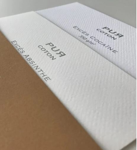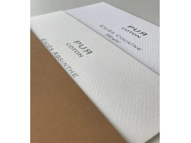 Pur Coton Excès este un carton embosat, fabricat 100% din bumbac, disponibil la 350 g. Suprafața texturată și catifelată oferă calitate și un aspect elegant tuturor proiectelor de design.